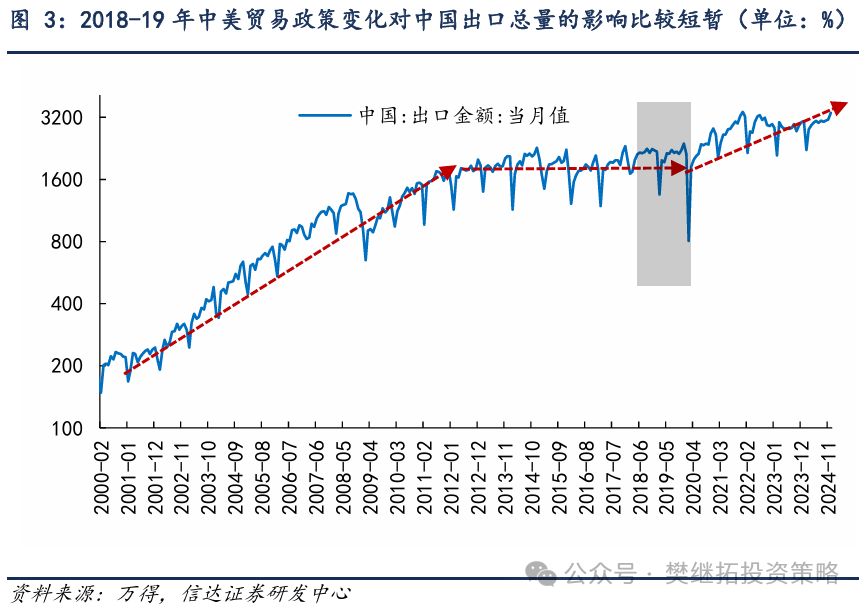 (2)美国贸易政策变化对国内资本市场影响有限,中国资产配置迎来良机。春节期间,美国关税政策成为市场关注的焦点。最终变化显示,对中国关税上调幅度低于投资者预期,而对墨西哥和加拿大的关税政策落地时间和速度则比预期更为悲观。我们认为,鉴于海外投资者对中国资产配置比例较低,中国具备丰富的经验应对美国贸易政策。此外,2018-2019年的中美贸易政策调整并未对中国总出口量产生趋势性影响。因此,美国贸易政策的变化对中国资本市场的影响预计较小。在全球资本市场波动背景下,中国资产的估值性价比凸显,甚至可能吸引更多资金。