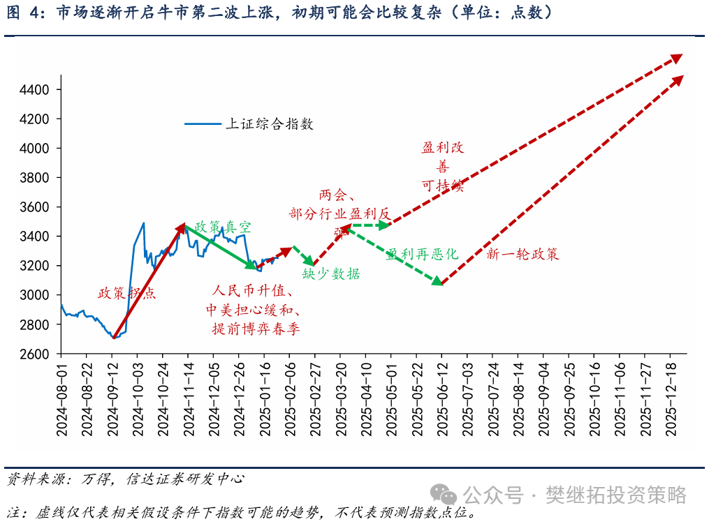 在早前的报告《春节前可能是第二次买点》中,我们已指出2024年9月初为当前牛市的首个理想买点,并预测春节前将是下一个值得重点关注的时间窗口。当前市场正处于上涨初期,主要受到春节前后资金活跃度的提升、美国贸易政策低于预期的积极影响,以及港股市场的强劲表现。根据季节性规律,春节后1-2周内股市大概率将呈现强势,而2月下旬则需重点关注春节后开工数据的验证,这一数据的重要性远超季节性因素。鉴于各行业盈利兑现的预期普遍偏低,我们预计牛市第二波上涨的初期步伐将较为缓慢。同时,Deepseek强化了AI产业链的长期发展前景,但也增加了AI产业链利润兑现的不确定性,短期内可能加剧成长股的波动性。因此,春节后市场风格可能会有所变化。