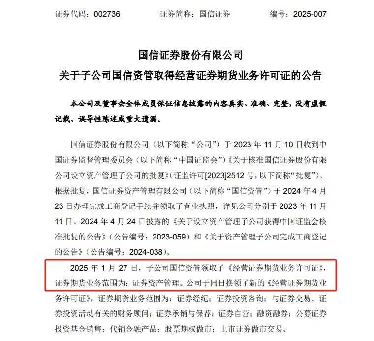 2月5日,国信证券发布公告称,子公司国信资管已于1月27日领取了《经营证券期货业务许可证》,业务范围涵盖证券资产管理。这意味着国信资管的筹建工作已顺利通过地方证监局的验收,即将迎来正式开业。