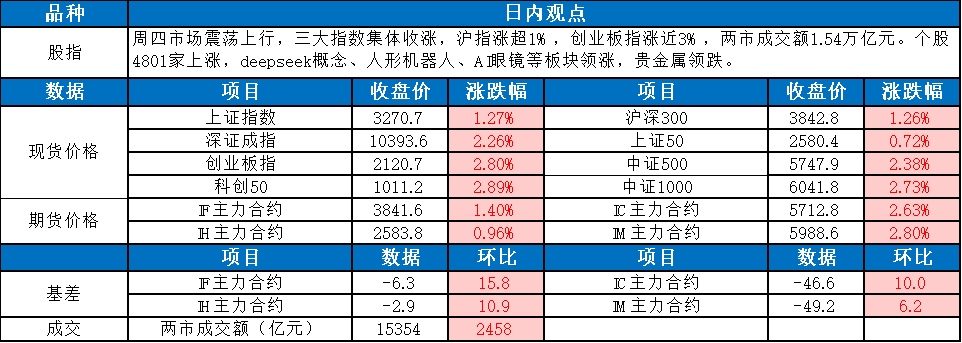周四,A股市场呈现震荡上行态势,三大指数集体收涨。其中,沪指涨幅超过1%,创业板指更是大涨近3%,两市成交额达到1.54万亿元。个股方面,共有4801家上涨,Deepseek概念、人形机器人、AI眼镜等板块领涨市场,而贵金属板块则领跌。截至收盘,上证指数报3270.66点,上涨1.27%;深证成指报10393.63点,上涨2.26%;创业板指报2120.75点,上涨2.80%;沪深300指数报3842.83点,上涨1.26%;上证50指数报2580.43点,上涨0.72%;中证500指数报5747.90点,上涨2.38%;中证1000指数报6041.83点,上涨2.73%。