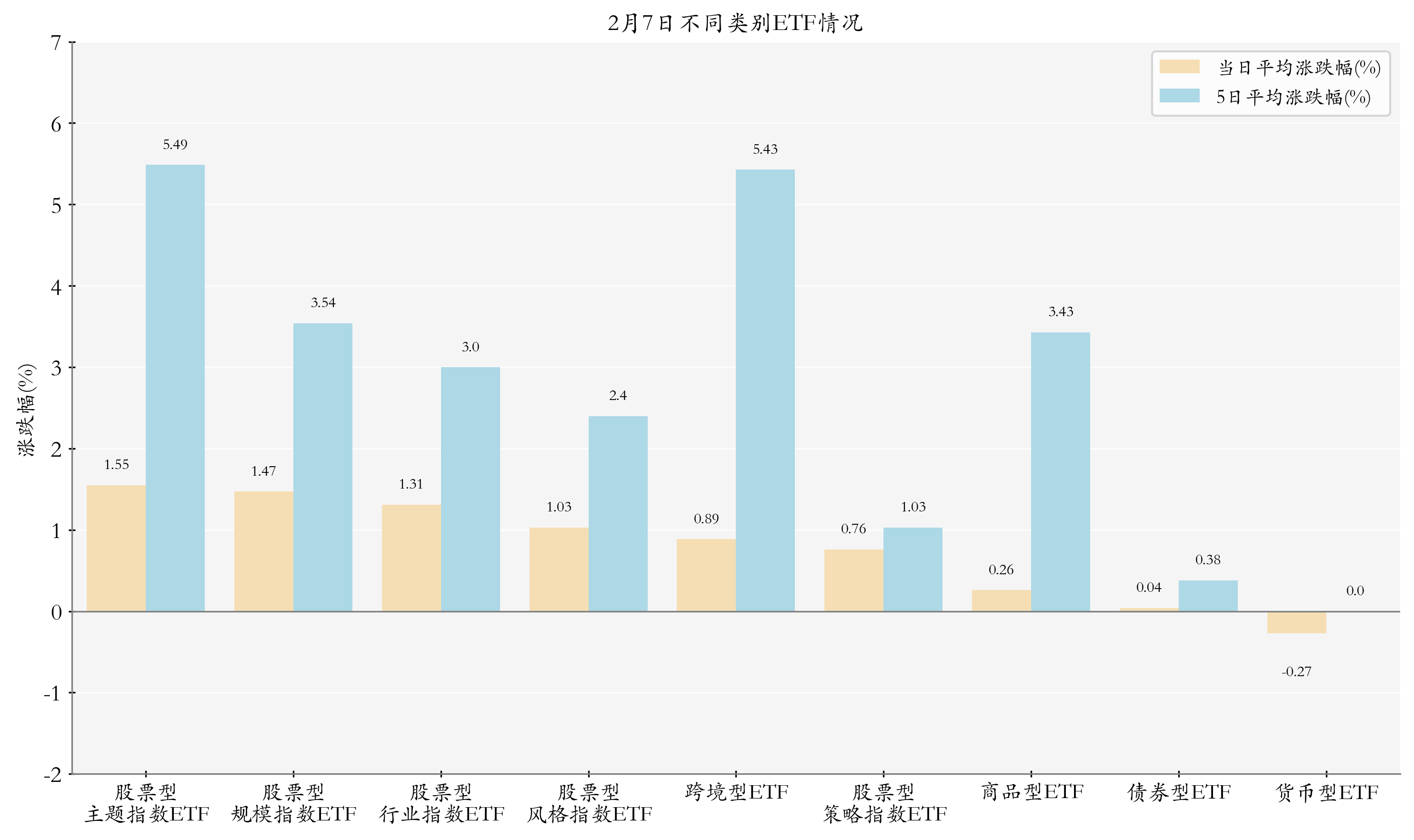 根据ETF基金的规模和涨跌幅数据,我们计算了不同分类下各类ETF基金的平均涨跌幅。今日,股票型主题指数ETF表现最为突出,平均涨跌幅达到1.55%;而货币型ETF表现相对较弱,平均涨跌幅仅为0.27%。