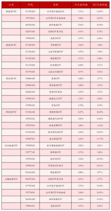 在今日的市场中,股票型ETF中表现最为抢眼的前三名分别为云计算沪港深ETF(517390.SH)、云计算ETF华泰柏瑞(159738.SZ)和软件指数ETF(560360.SH),收益率分别达到5.76%、5.08%和5.04%。这些ETF产品的优异表现,反映了市场对云计算等科技领域的强烈关注。