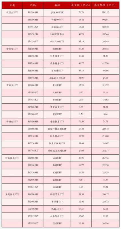 从成交额来看,股票型ETF中成交额排名前三的产品分别为沪深300ETF(510300.SH)、科创50ETF(588000.SH)和创业板ETF(159915.SZ),成交额分别达到76.70亿元、65.42亿元和58.38亿元。这些ETF产品的活跃交易,体现了市场对核心资产的持续关注。