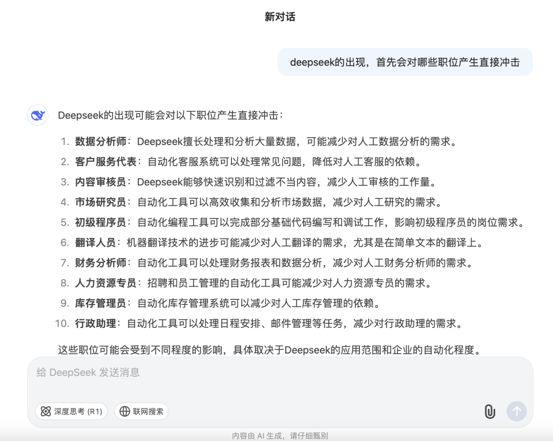 针对《国际金融报》记者提出的“DeepSeek首先会对哪些职位产生直接冲击”的问题,DeepSeek迅速列出了包括市场研究员、库存管理员、内容审核员等在内的10类可能受影响的职业,并详细阐述了相关原因。