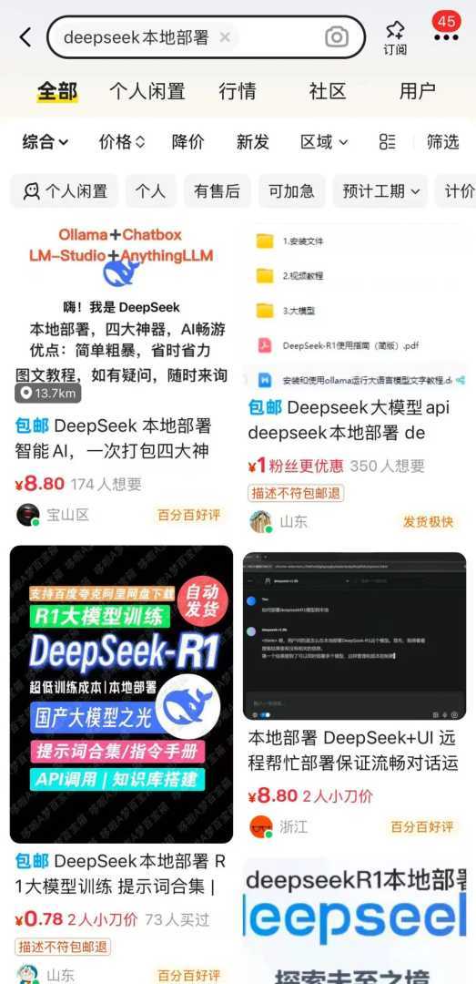 与此同时,一部分群体在担忧被DeepSeek取代而失业时,另一些群体却已敏锐地捕捉到了商机。在电商平台上,商家们纷纷推出“本地部署”、“新手必备”等噱头的DeepSeek接入教程,价格从0.01元至百元不等。