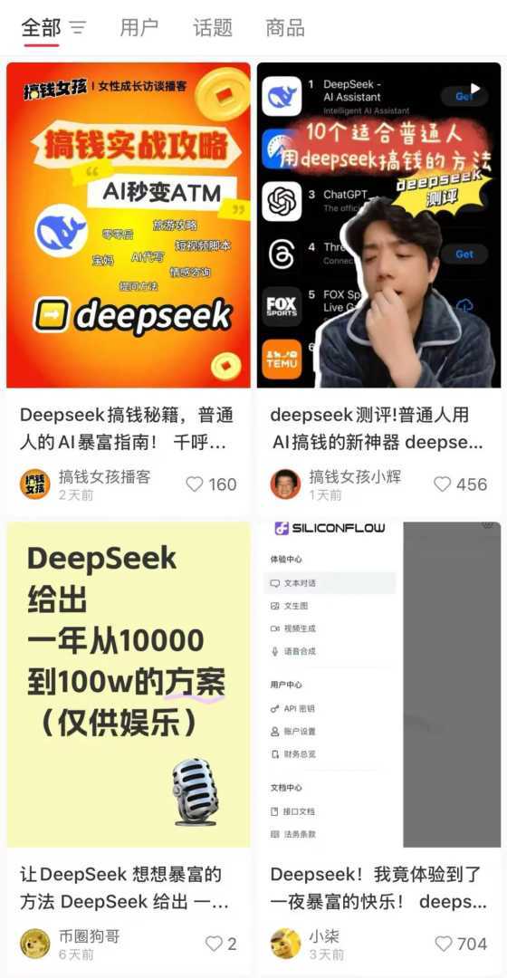 与ChatGPT火爆时的情景相似,如今这股“DeepSeek掘金热”也已蔓延至小红书等社交平台。各种“DeepSeek官方使用指南”、“DeepSeek保姆级教程”等付费课程如雨后春笋般涌现,吸引了大量技术爱好者和想要利用DeepSeek提升效率、开拓副业的用户。