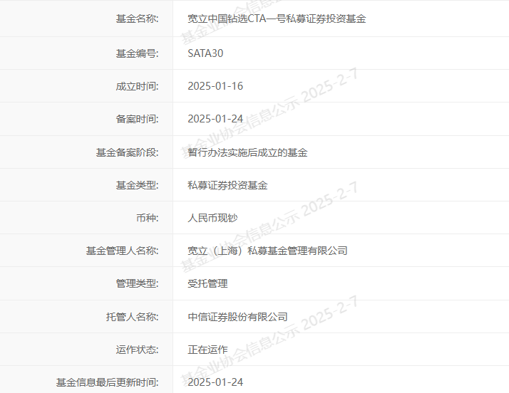 具体而言,宽立中国钻选CTA一号私募证券投资基金于今年1月16日正式宣告成立,并紧锣密鼓地在1月24日完成了备案程序。该基金被归类为私募证券投资基金,其托管职责由中信证券承担。这一动态不仅体现了宽立资本对中国市场的深度承诺,也标志着外资私募在中国市场上的又一重要布局。