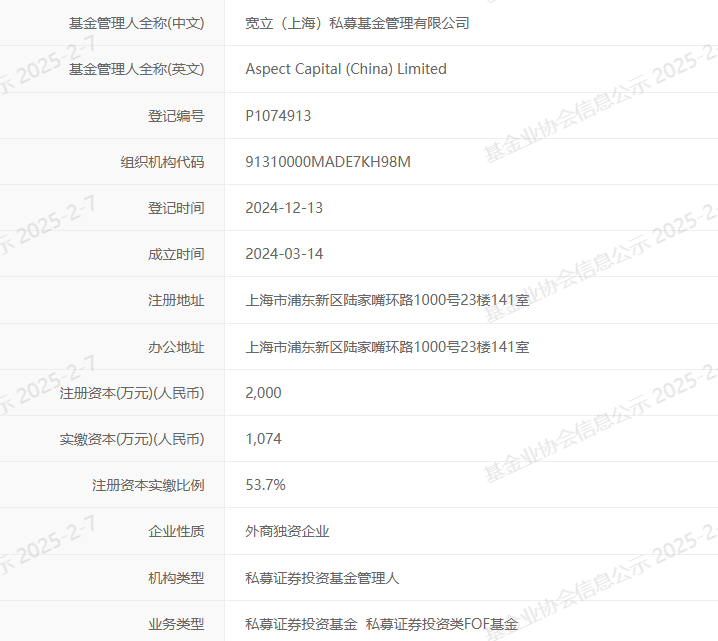 据深入了解,宽立私募基金由英国知名量化投资机构宽立资本全资控股,公司成立于2024年3月14日,并于同年12月13日正式在中国基金业协会登记为私募证券管理人。其注册资本高达2000万元人民币,彰显了公司的雄厚实力。