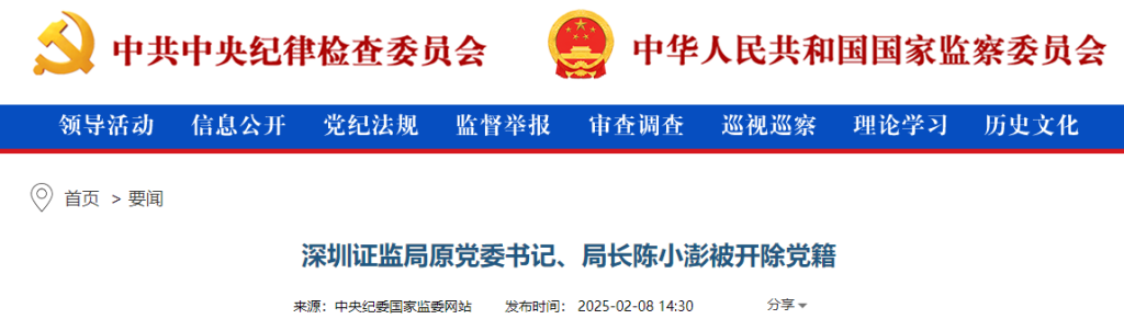 近日,深圳证监局原党委书记、局长陈小澎因严重违纪违法被开除党籍。这一消息由中央纪委国家监委驻中国证券监督管理委员会纪检监察组与江西省纪委监委联合发布,于2025年2月8日正式公布。