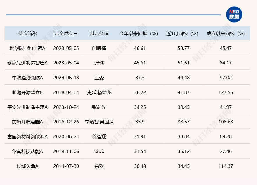 具体来看,闫思倩管理的鹏华碳中和主题A以46.61%的年内回报率领跑市场;紧随其后的是张璐管理的永赢先进制造智选A,年内回报率为45.61%。值得一提的是,这两只产品近一个月的回报率均超过了50%,业绩表现十分抢眼。