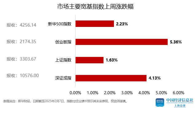 上周,国内资本市场表现强劲,各大宽基指数普遍上扬。具体而言,上证指数周度涨幅达到1.63%,深证成指则实现了4.13%的增长,创业板指更是以5.36%的涨幅领跑市场。此外,新华500指数也录得了2.23%的周度涨幅,该指数在上周内窄幅震荡,开盘报4194.2点,至周五收盘时已攀升至4256.14点,全周振幅为3.73%,成交额高达1.58万亿元。