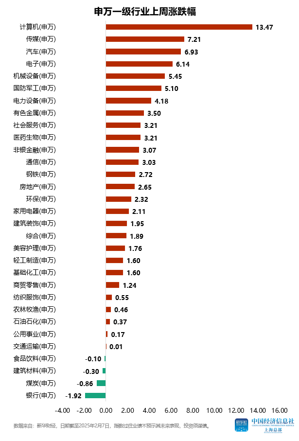 在行业层面,上周多数行业指数呈现上涨态势,其中计算机、传媒、汽车、电子等行业表现尤为突出,涨幅位居前列。相比之下,银行、煤炭、建筑材料、食品饮料等行业则逆市下跌,表现相对疲弱。