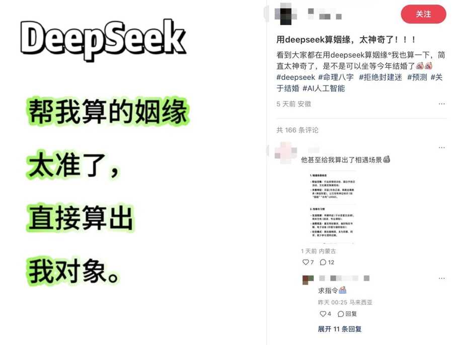 笔者发现,越来越多的年轻人在社交网络上分享了自己用DeepSeek算命和找对象的经历。