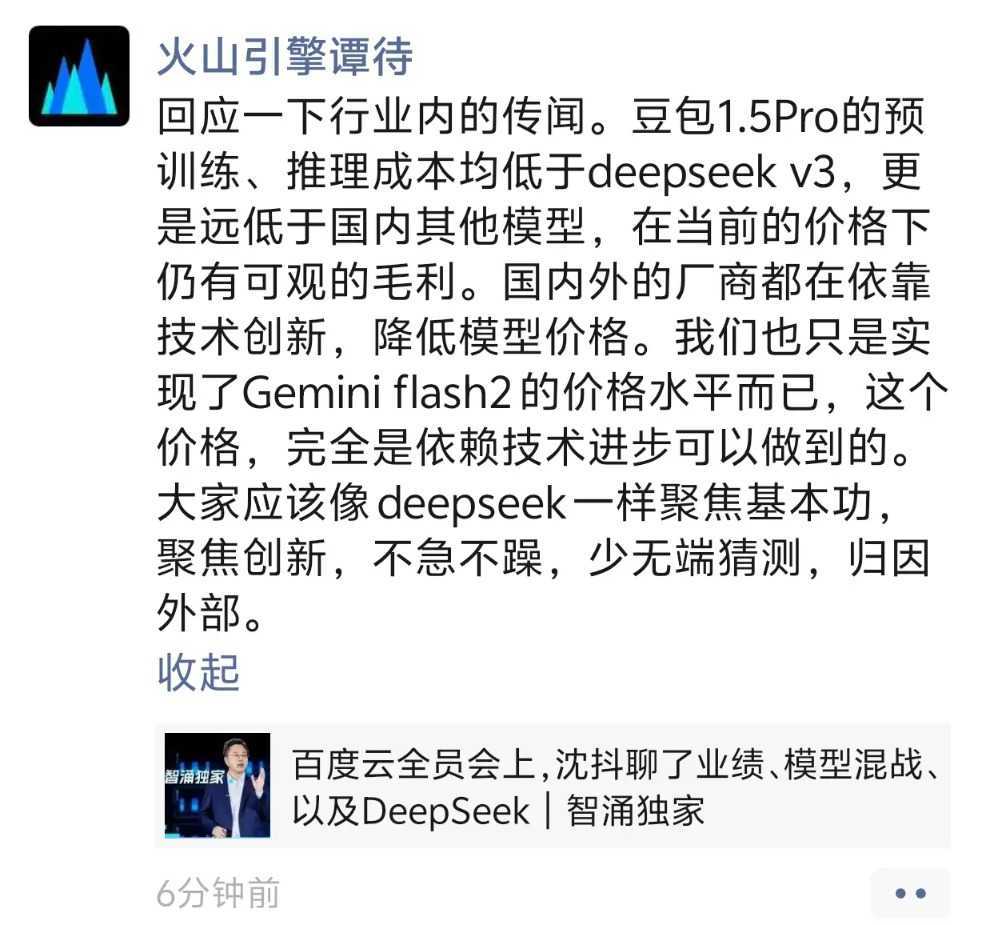 谭待指出,豆包1.5Pro模型的预训练成本、推理成本均低于Deepseek V3,远低于国内其他模型,在当前价格下拥有良好毛利。他强调,国内外厂商均依靠技术创新降低模型价格,豆包只是实现了Gemini 2.0 Flash的价格水平。