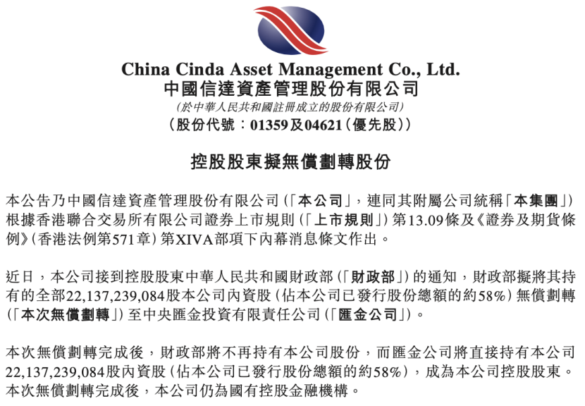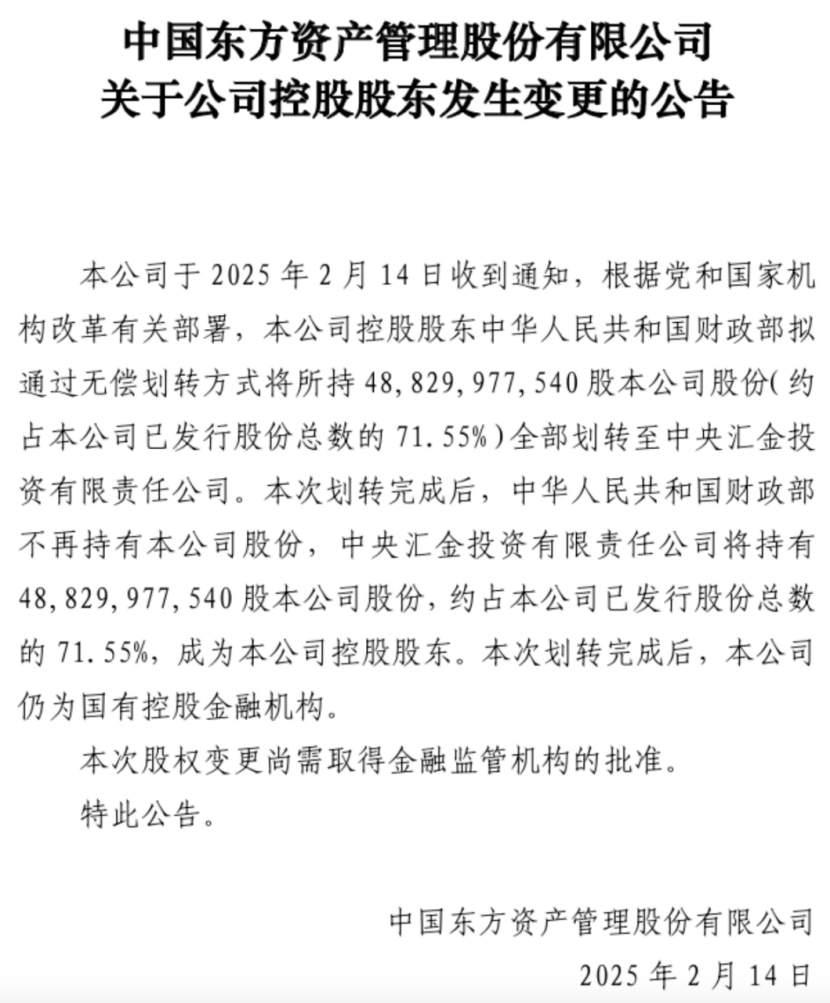 同日,长城资产、东方资产及中国信达均发布公告,称根据党和国家机构改革有关部署,其控股股东财政部拟将所持股份无偿划转至中央汇金。此次划转完成后,财政部将不再持有这些公司股份,中央汇金将成为控股股东。