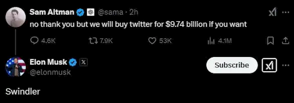 然而,剧情在11日发生了戏剧性转折。OpenAI的首席执行官奥尔特曼在社交媒体上发帖称:“不了,谢谢。但如果你愿意的话,我们可以花97.4亿美元收购推特。”这一回应显得颇为幽默且带有挑衅意味。