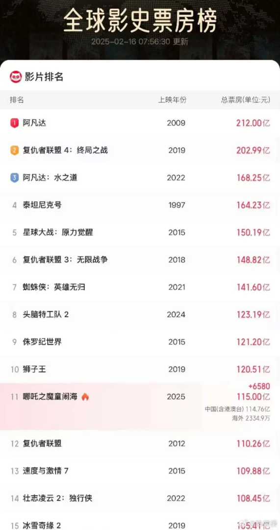 《哪吒2》票房破115亿,冲击全球票房影史榜前十
