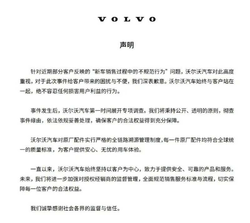 沃尔沃回应称,将加强对授权经销商的监督管理,全面规范销售服务标准与流程,保障消费者权益。已第一时间展开专项调查。