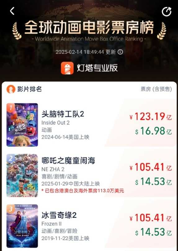 据灯塔专业版全球票房榜显示,截至2月14日,影片《哪吒之魔童闹海》(以下简称《哪吒2》)全球票房(含预售)突破14.53亿美元(含海外票房113万美元),成功跻身全球动画电影票房榜前二,同时闯入全球电影票房榜前十四名。这一成绩彰显了国产动画电影的强大实力。