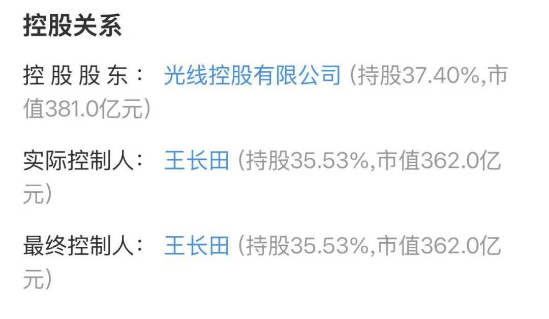 据同花顺数据显示,光线传媒老板王长田目前持有公司约35.53%的股份,在股价暴涨后,王长田成为最大赢家,7个交易日内身家暴增262亿元,目前其持有的光线传媒股权市值已达362亿元。