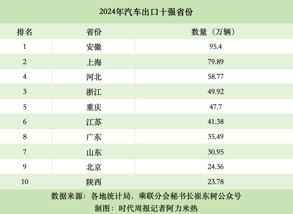 汽车出口靠谁撑起?2024年,汽车出口前十强省份分别为安徽、上海、河北、浙江、重庆、江苏、广东、山东、北京和陕西。安徽取代上海成为汽车出口第一省份,出口量约为95.4万辆。