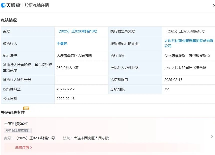 天眼查法律诉讼信息显示,2月13日,王健林新增两条股权冻结信息,再次引发市场关注。