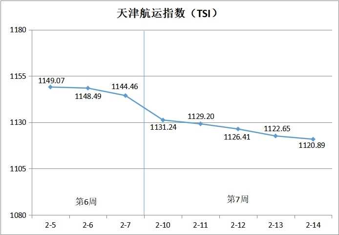 2025年第7周,中国北方内外贸海运价格风向标——天津航运指数(TSI)收于1120.89点,累计下跌2.06%。分类别看,北方国际集装箱运价延续跌势,干散货运价同样走弱,而沿海集装箱运价则小幅上涨。