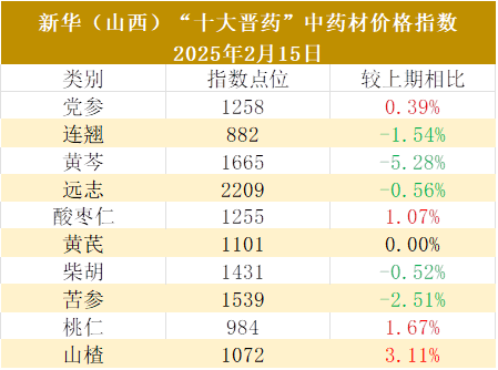 截至2月15日,新华(山西)“十大晋药”中药材价格指数报1340点,较上期下跌0.74%。连翘、黄芩、苦参等价格下跌,酸枣仁、桃仁、山楂等上涨。新华财经发布指数,为市场参与者提供数据参考。