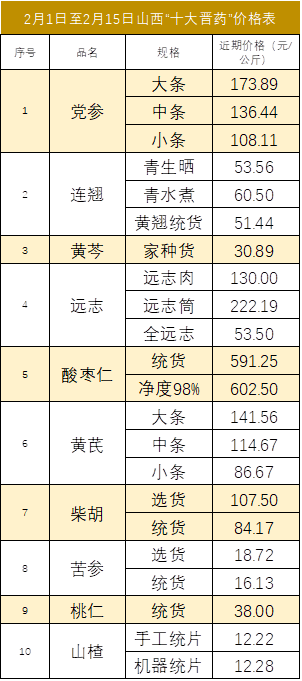 图3 2月1日至2月15日山西“十大晋药”价格表