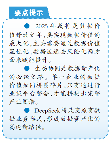 广电计量副总经理于莉莉博士表示,2025年将是数据价值释放之年,需通过数据价值显性化、数据流通去风险化两方面赋能提升。DeepSeek带来数据产业化模式的重大创新变革。