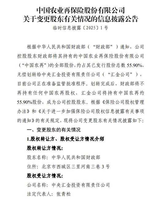 中国农业再保险股份有限公司(下称“中国农再”)近日发布公告称,公司控股股东财政部将其持有的中国农再的全部股份,约占已发行股份总数的55.90%,无偿划转给中央汇金投资有限责任公司(下称“中央汇金”)。
