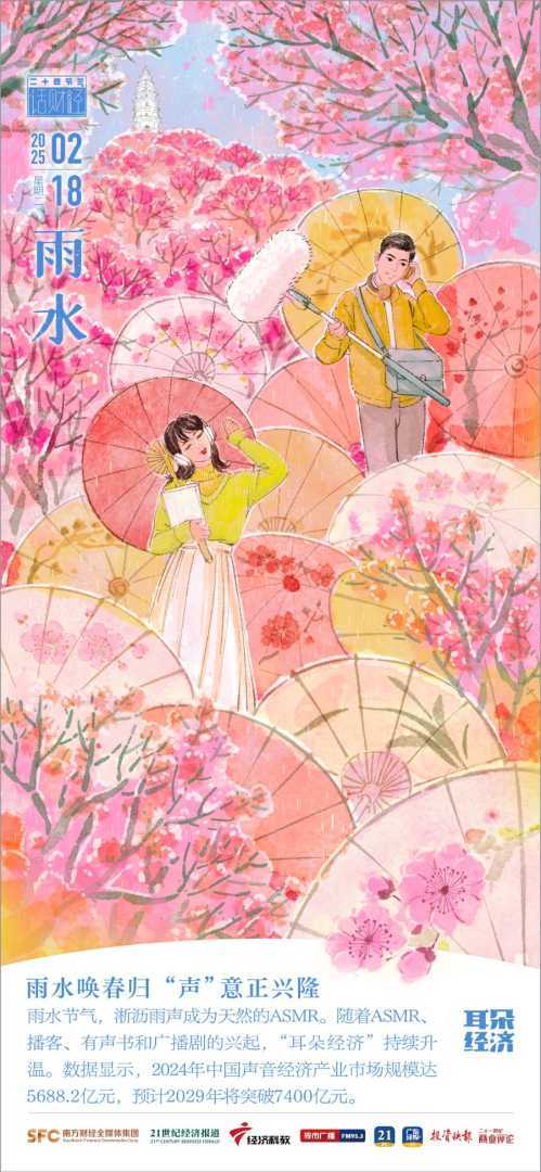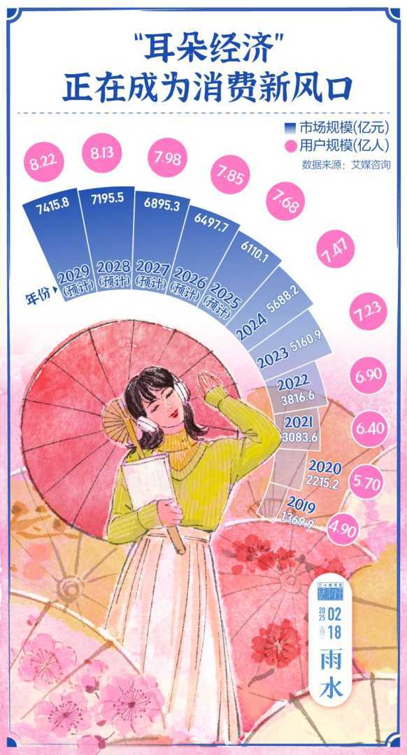 “好雨知时节,当春乃发生。”今日雨水(2025年2月18日),淅沥雨声不仅是春天的序曲,更催生了天然的听觉消费新场景——ASMR。近年来,ASMR、播客、有声书、广播剧等音频内容蓬勃发展,构建起一个“用耳朵感知世界”的消费生态。春雨绵绵中,“耳朵经济”不负春光,展现出千亿市场的蓬勃生机。