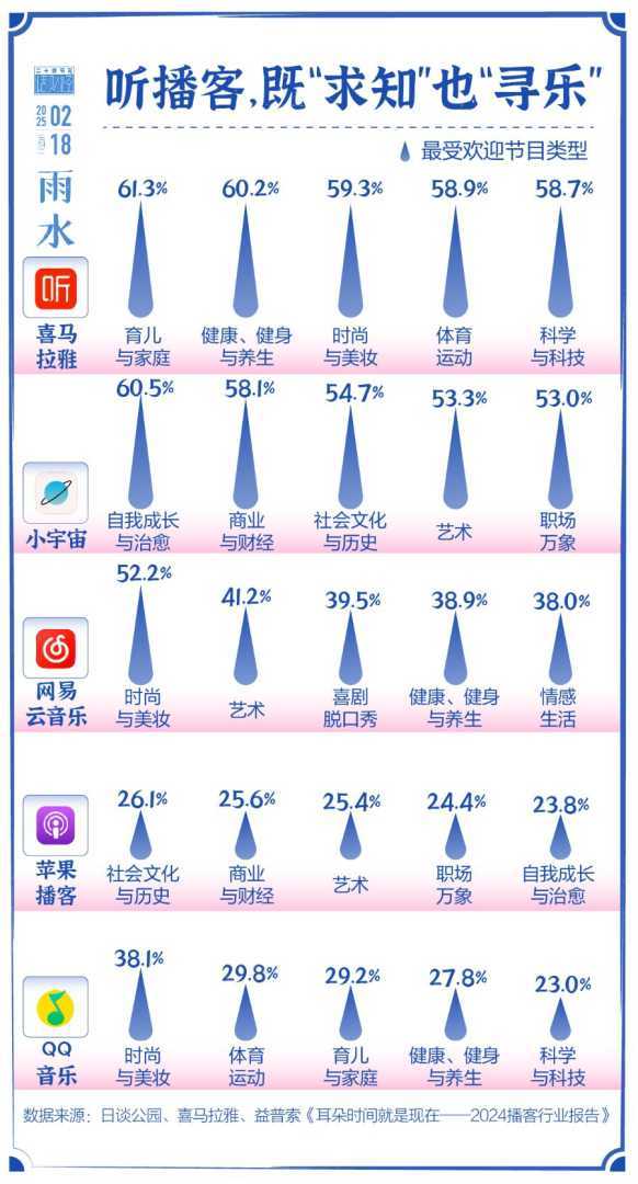 用户选择不同内容,但共同追求“慢下来、静下来、收获新知”。喜马拉雅平台人文、国学等内容增长迅速,娱乐内容也未式微。