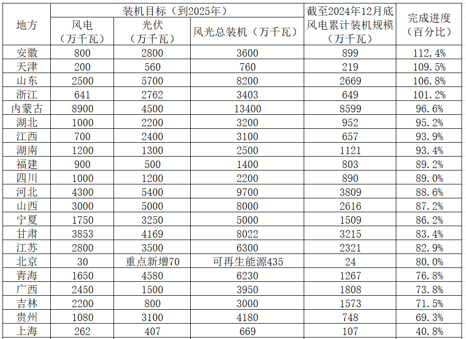数据显示,截至2024年12月底,安徽、天津、山东、浙江已完成“十四五”规划中到2025年风电累计装机目标,完成进度分别为112.4%、109.5%、106.8%和101.2%。