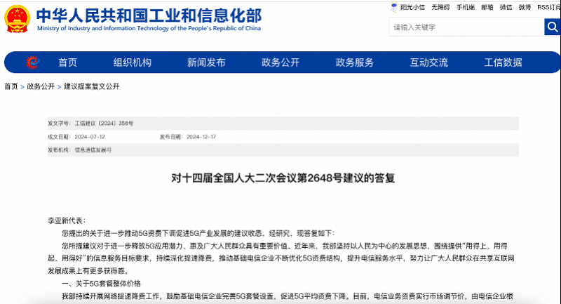 根据工信部答复,目前电信业务资费由市场调节,基础电信企业已推出多种5G套餐,最低月费已降至40元档位,5G套餐用户渗透率超75%,5G发展步入快车道。