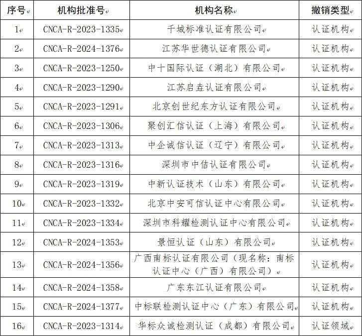 此次被撤销批准资质的16家认证机构名单已公布,并附有详细图片资料。
