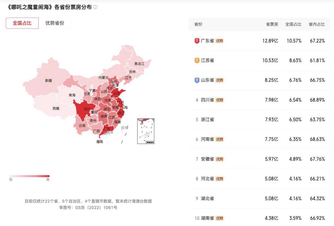 紧随其后的是江苏省,票房达到10.53亿元,占比8.63%。山东省则以8.25亿元的票房位列第三,占比6.76%。这些数据不仅反映了各地区对高质量动画电影的强烈需求,也展示了中国电影市场的巨大潜力。