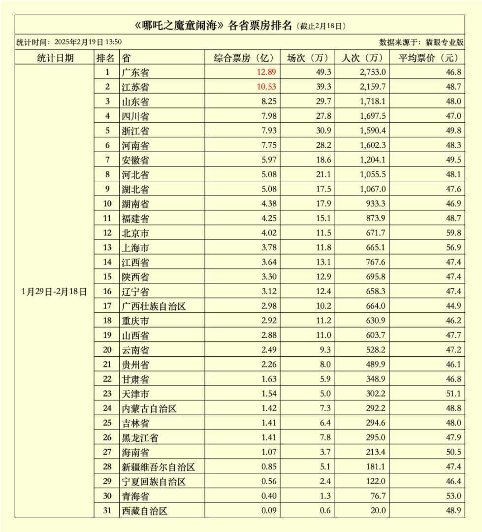 根据猫眼专业版最新数据,截至2月18日,动画电影《哪吒之魔童闹海》在全国各省票房排名中表现出色。广东省以12.89亿元的票房成绩,占比全国10.57%,稳居榜首,彰显了广东影迷的热情与支持。