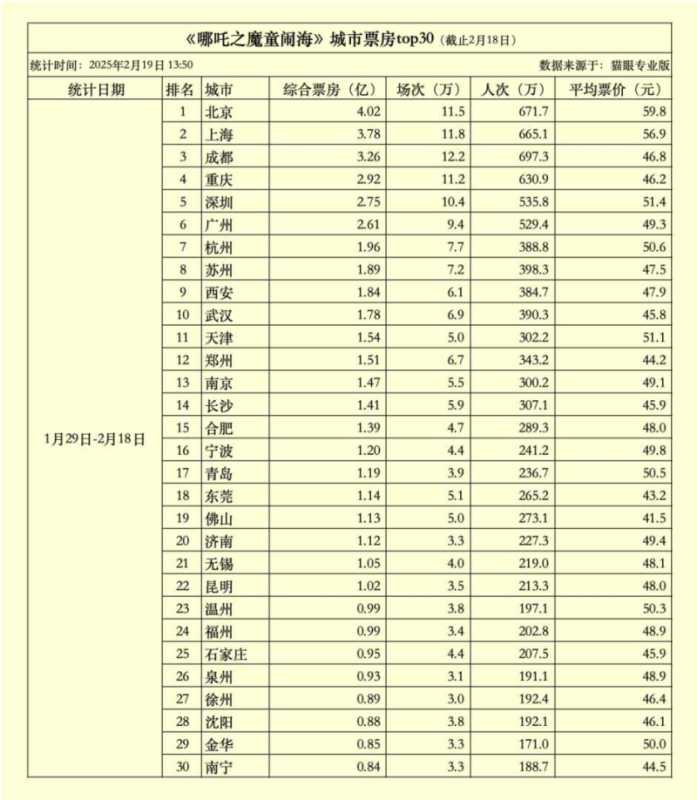 在城市票房榜上,为《哪吒之魔童闹海》贡献最大的城市前五位依次为北京、上海、成都、重庆、深圳。此外,广州、杭州、苏州、西安、武汉等城市也跻身前十,显示出这些城市在电影消费方面的强劲实力。