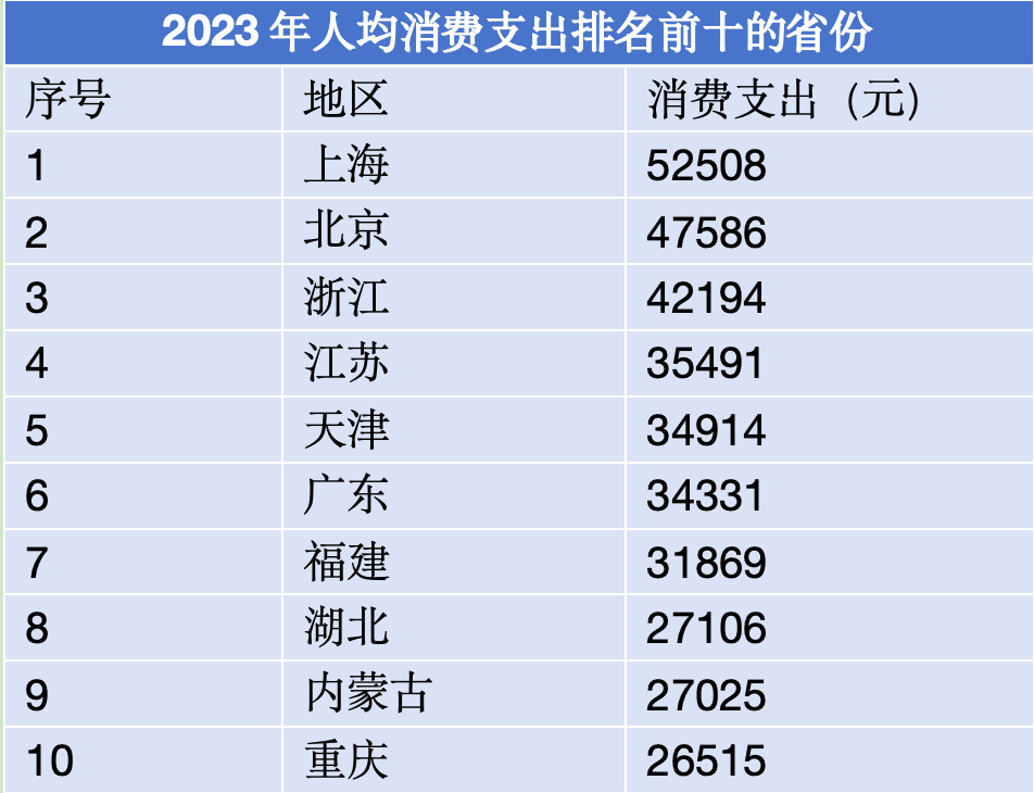 2023年,上海、北京、浙江、天津、江苏、广东、福建、山东的居民人均可支配收入超过全国平均水平,这些省份在人均消费支出排行榜上也占据前列。