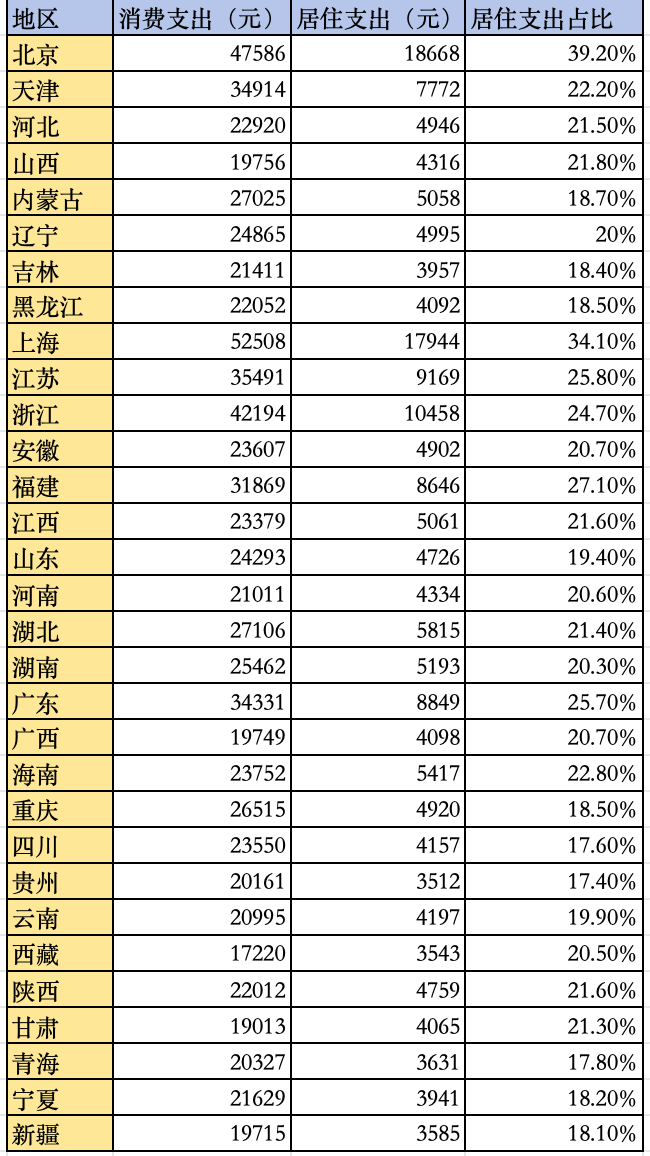 在居住消费支出占比方面,北京最高,达39.2%;上海为34.1%;福建则超过江苏和广东,位居第三,高达27.1%。这与当地房价水平密切相关。