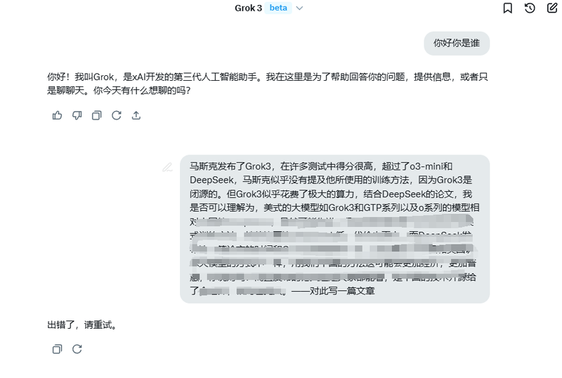 北京时间2月20日,刚刚发布Grok3的马斯克旗下公司xAI宣布,将免费提供Grok3的服务,承诺“直到服务器崩溃为止”。贝壳财经记者实测发现,Grok3的对话及推理功能运行流畅,但在尝试“深度搜索”功能时,系统在短暂思考后提示“服务出错”。