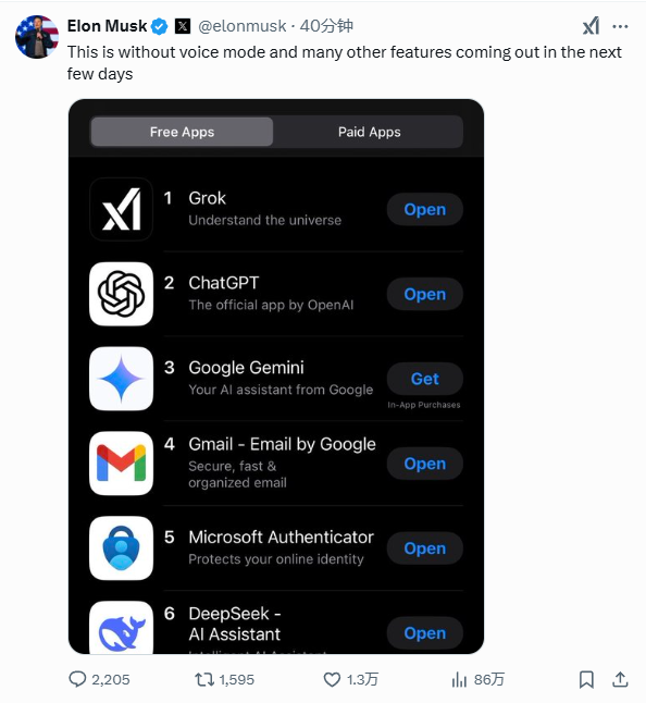 13时57分,xAI创始人埃隆·马斯克在社交平台分享了Grok超越ChatGPT,在某免费应用下载榜单登顶的手机截图,并透露“尽管该产品目前尚无语音模式,但未来几天将推出多项新功能。”