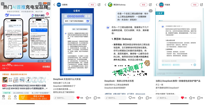 目前,AI回答中出现的品牌推荐大多属于被动植入,但已有不少商家/品牌开始主动利用AI背书。据蓝鲸记者不完全统计,安克、安慕希等多个品牌账号已发布相关内容。