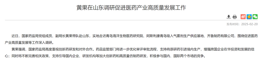 国家药监局官网20日发布消息称,国家药监局党组成员、副局长黄果近日带队赴山东,实地走访青岛海洋生物医药研究院、阿斯利康青岛吸入气雾剂生产供应基地、齐鲁制药有限公司,围绕促进医药产业高质量发展等工作深入调研。黄果在调研时强调,国家药监局高度重视创新药研发和对外合作,将全力支持医药产业高质量发展。药品监管部门将进一步优化审评审批流程,支持将原研药引进境内生产,增强跨国企业在中国投资和发展的信心。