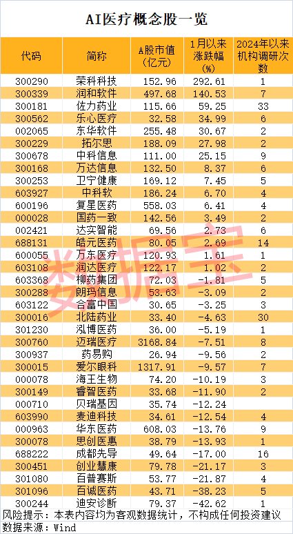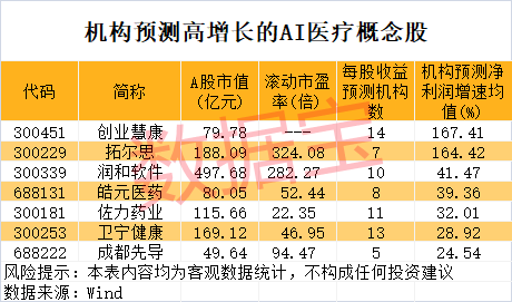 11月25日,AI医疗概念股表现强劲,多只股票涨停或大涨。今年以来,AI医疗概念股平均涨幅跑赢上证指数,其中荣科科技、润和软件、佐力药业等累计涨幅超20%。未来增长潜力方面,根据机构预测,皓元医药、创业慧康、润和软件等7只AI医疗概念股2024年至2026年净利润增速均有望超20%,其中创业慧康的Copilot智慧医疗助手备受瞩目。