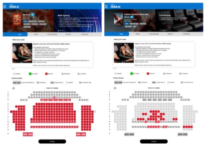 图片说明:22日悉尼IMAX电影院两场电影销售对比,红色为已售出座位。