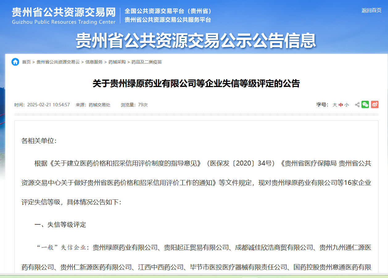 贵州公资交易中心公告显示,16家企业被分为“一般”、“中等”和“严重”三个失信等级。其中,“一般”失信企业包括贵州绿原药业有限公司、贵州九州通仁源医药有限公司等;“中等”失信企业有贵州中鑫医药有限公司等;“严重”失信企业则包括贵州慈惠医药有限公司、上海凯利泰医疗科技有限公司。