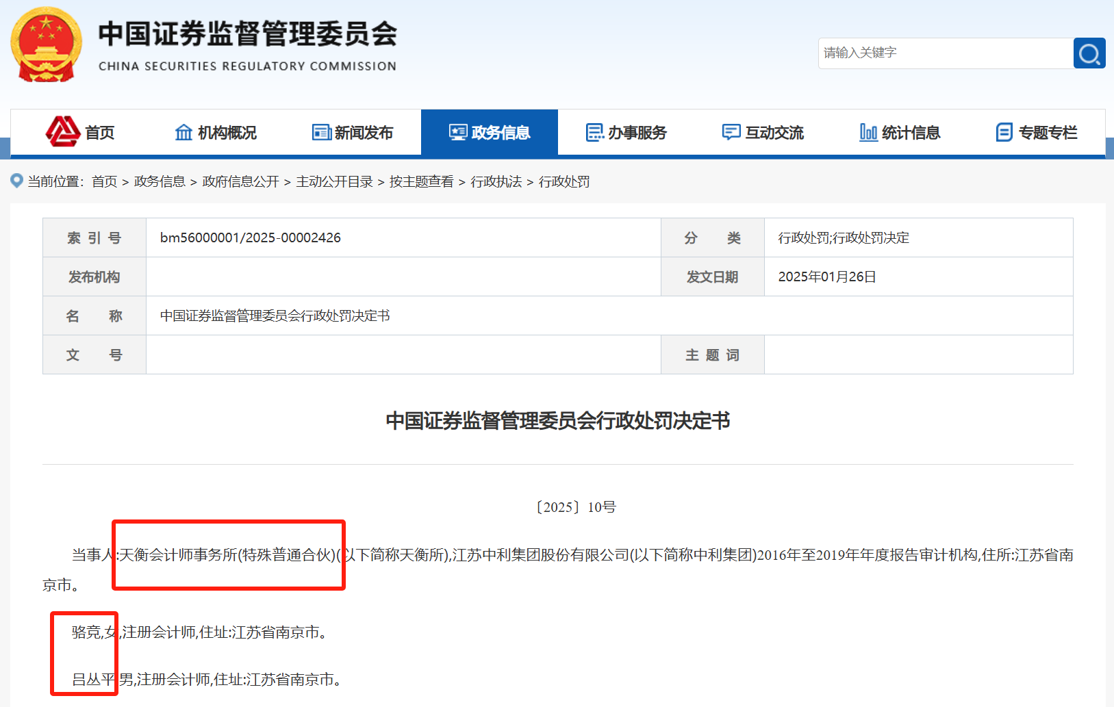 2月21日,中国证监会网站发布了对天衡会计师事务所(特殊普通合伙)(简称“天衡所”)及其两名会计师骆竞和吕丛平的行政处罚决定书。天衡所作为中利集团(现*ST中利)2016年至2019年的年度报告审计机构,其出具的审计报告存在虚假记载,因未勤勉尽责而遭受重罚。