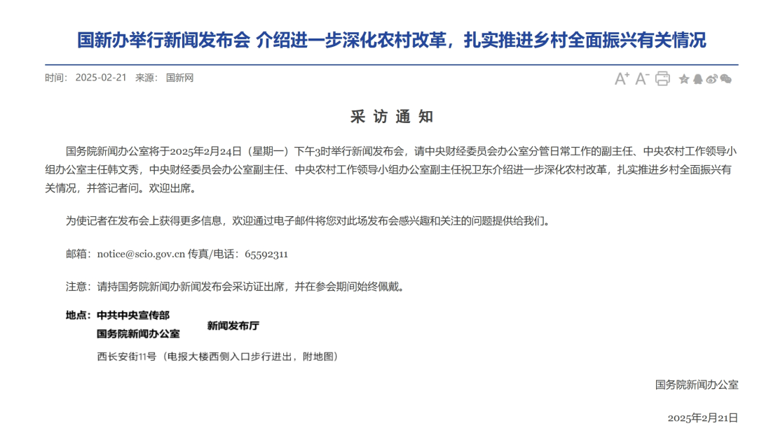 国务院新闻办公室将于2025年2月24日举行新闻发布会,介绍进一步深化农村改革、扎实推进乡村全面振兴有关情况,并答记者问,此次发布会将为农村改革提供新的方向和动力。